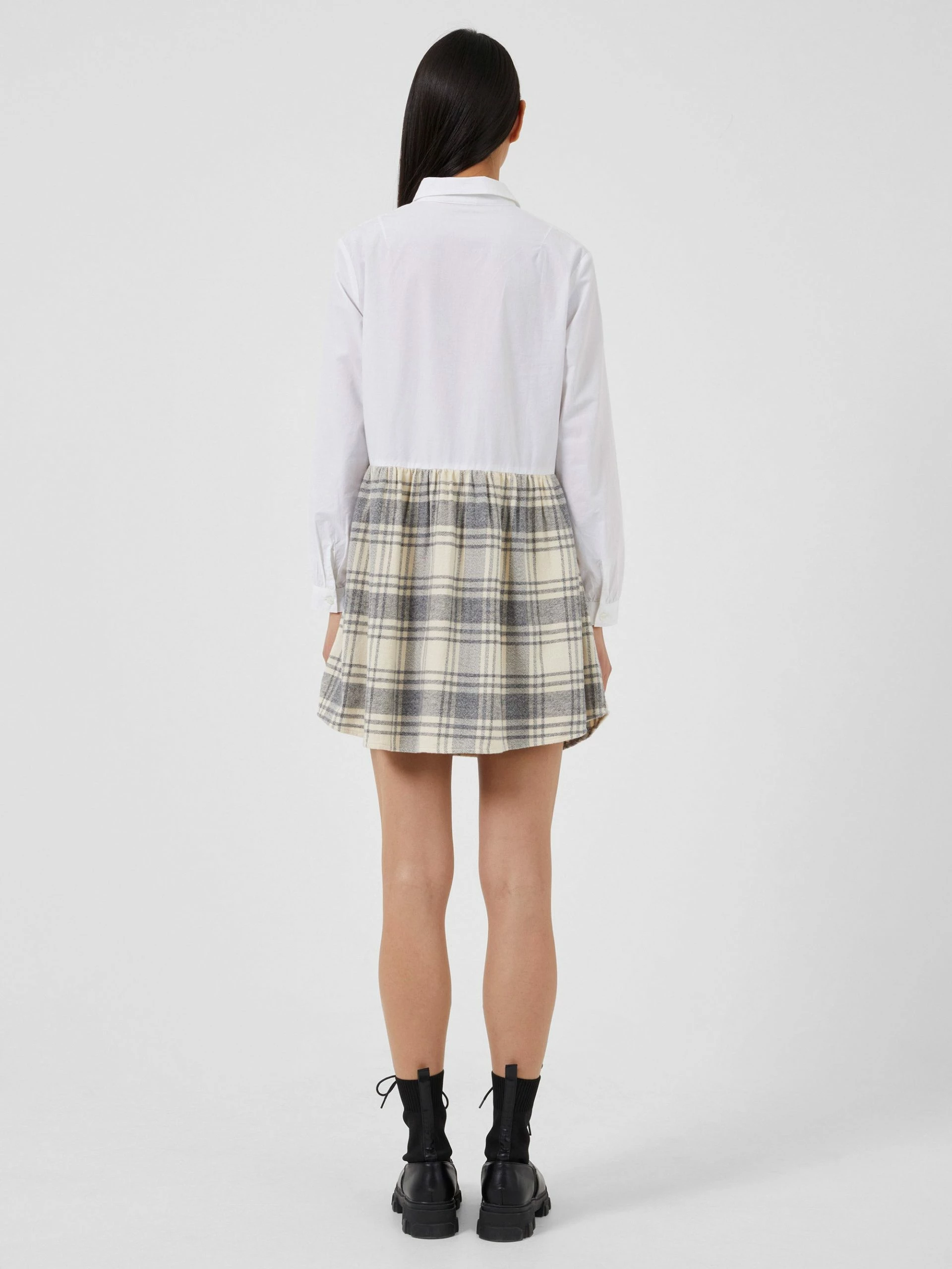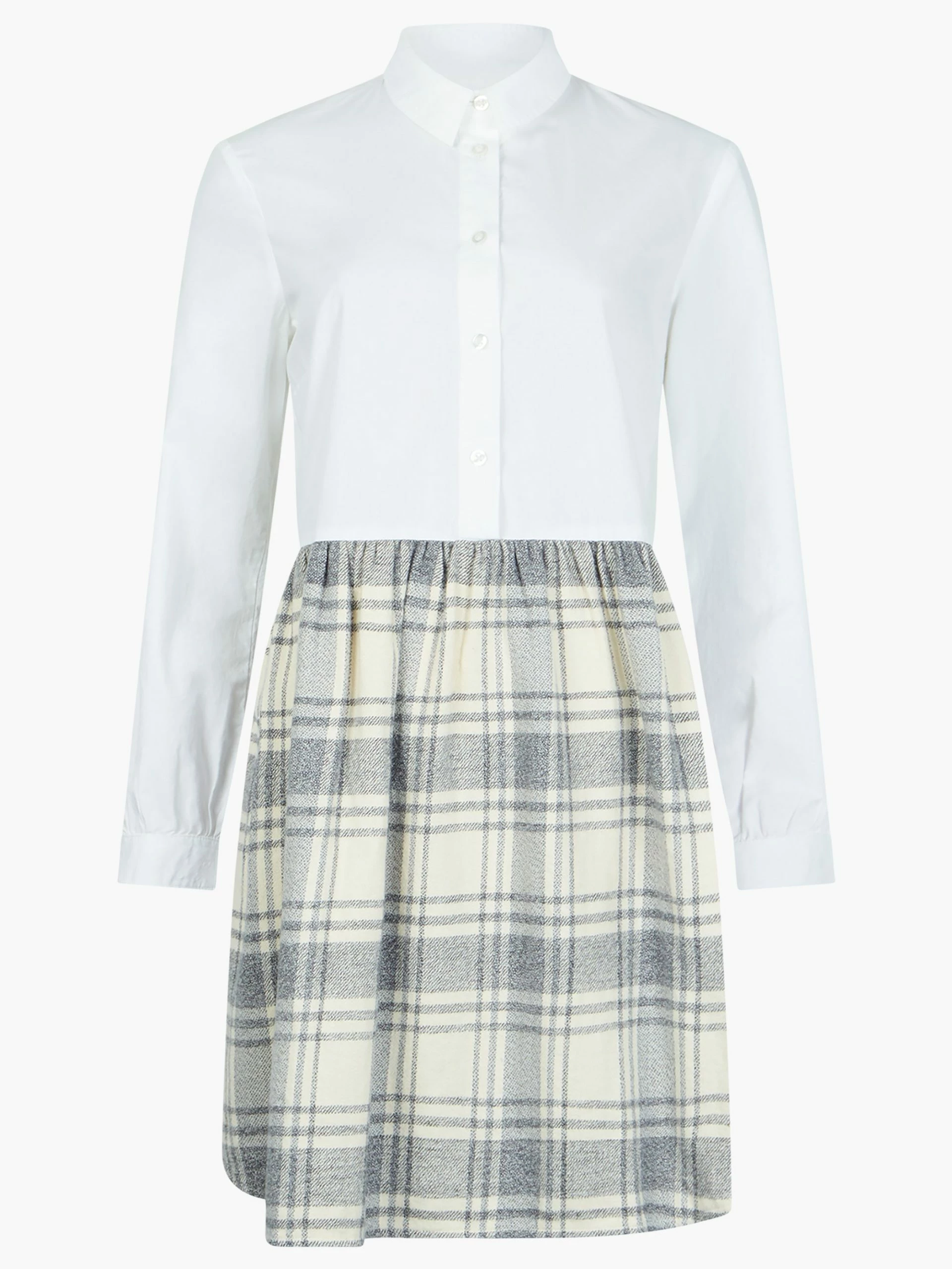 Effortlessly smart, effortlessly chic. Our Arla Flannel Shirt Dress is a cute addition to the wardrobe, with a classic white shirt bodice with collar, long tab sleeves and front button fastenings whilst the charming flannel skirt cuts to a mini length for an all-in-one wonder.