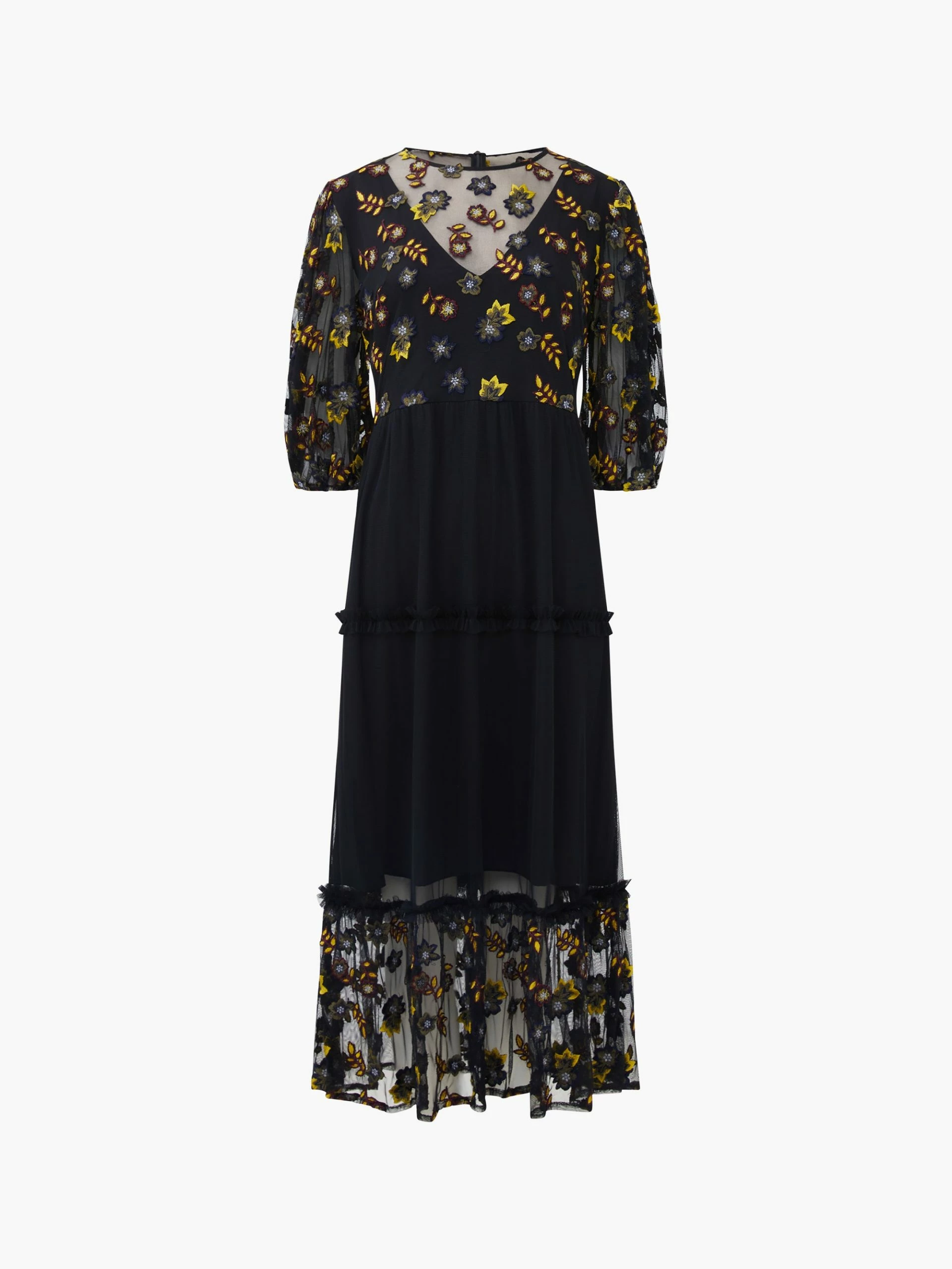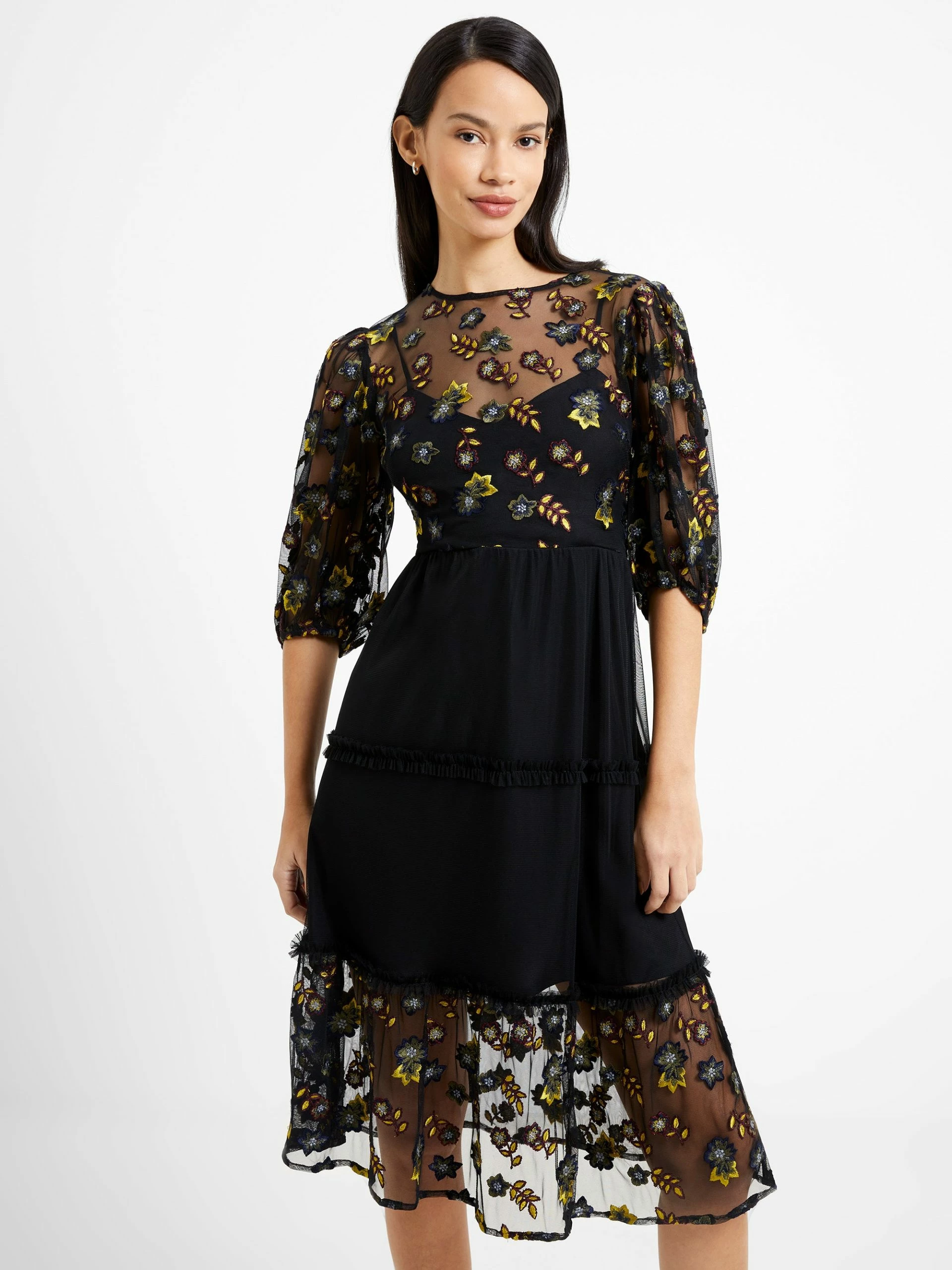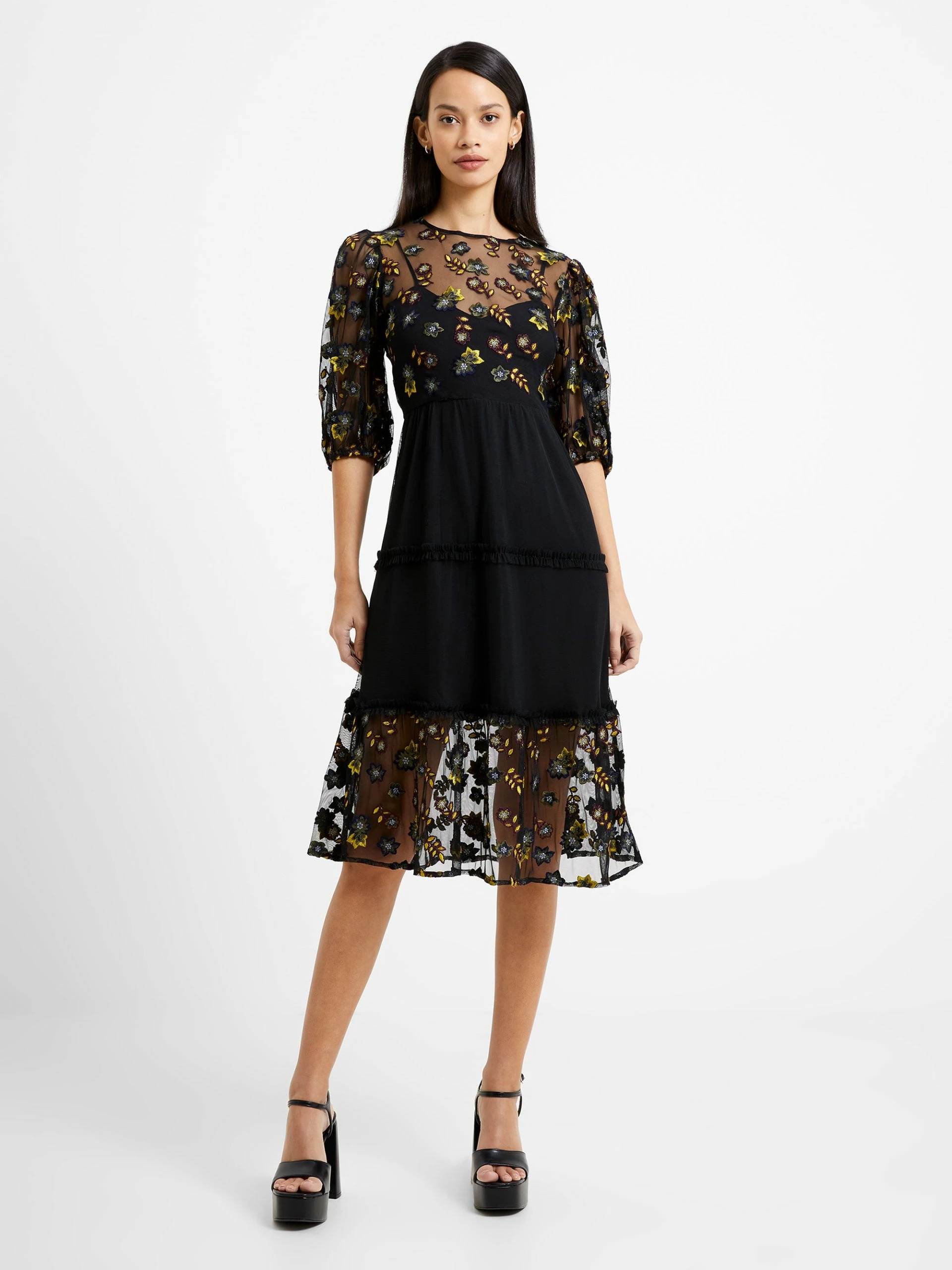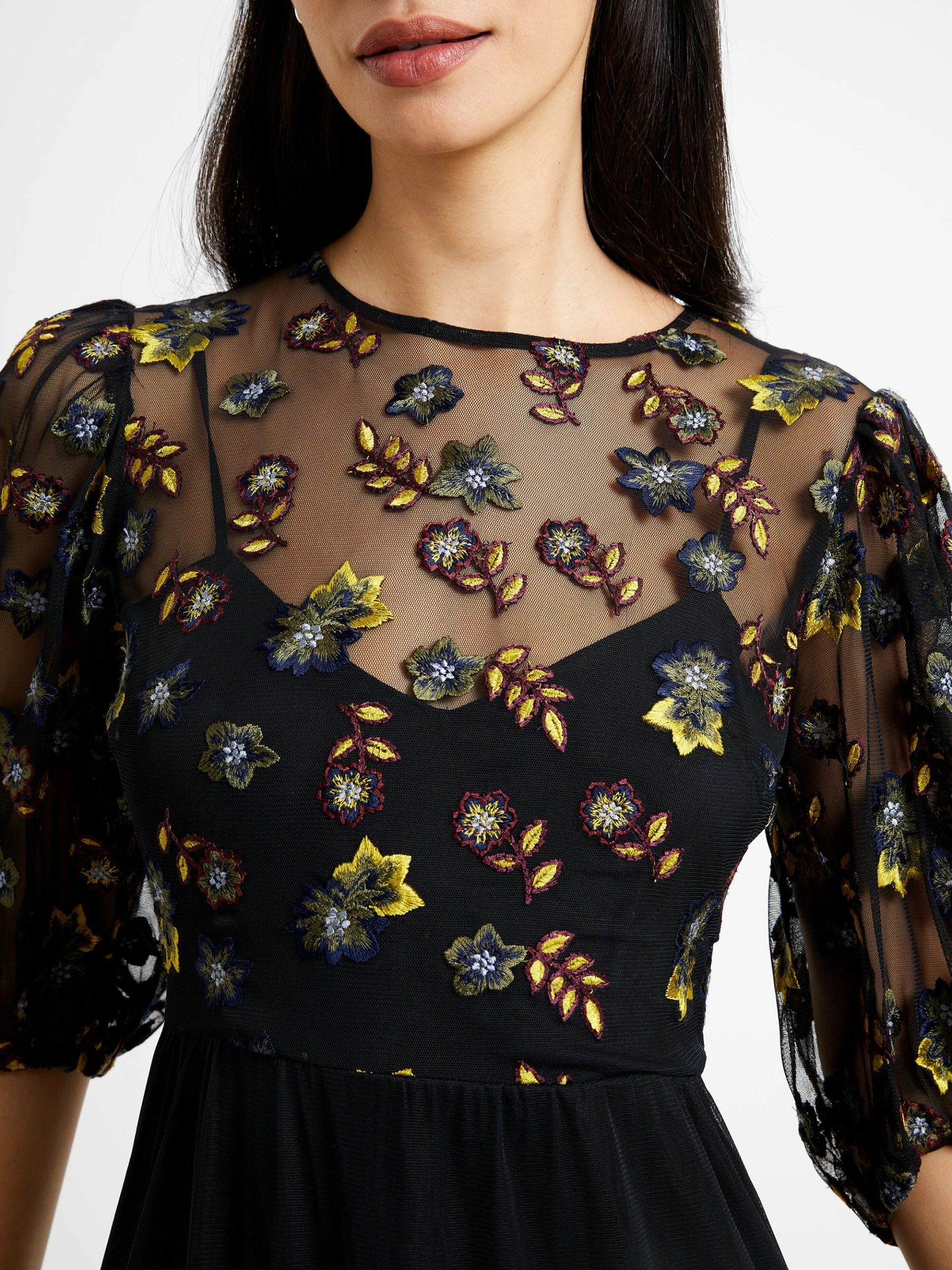 Classic meets contemporary to create our captivating Camielle Embroidered Midi Dress. A minimalist black slip dress sits beneath a flattering midi length mesh dress, adorned with intricate floral embroidery which is destined to blossom in your wardrobe. Elegance meets endearing with this style.