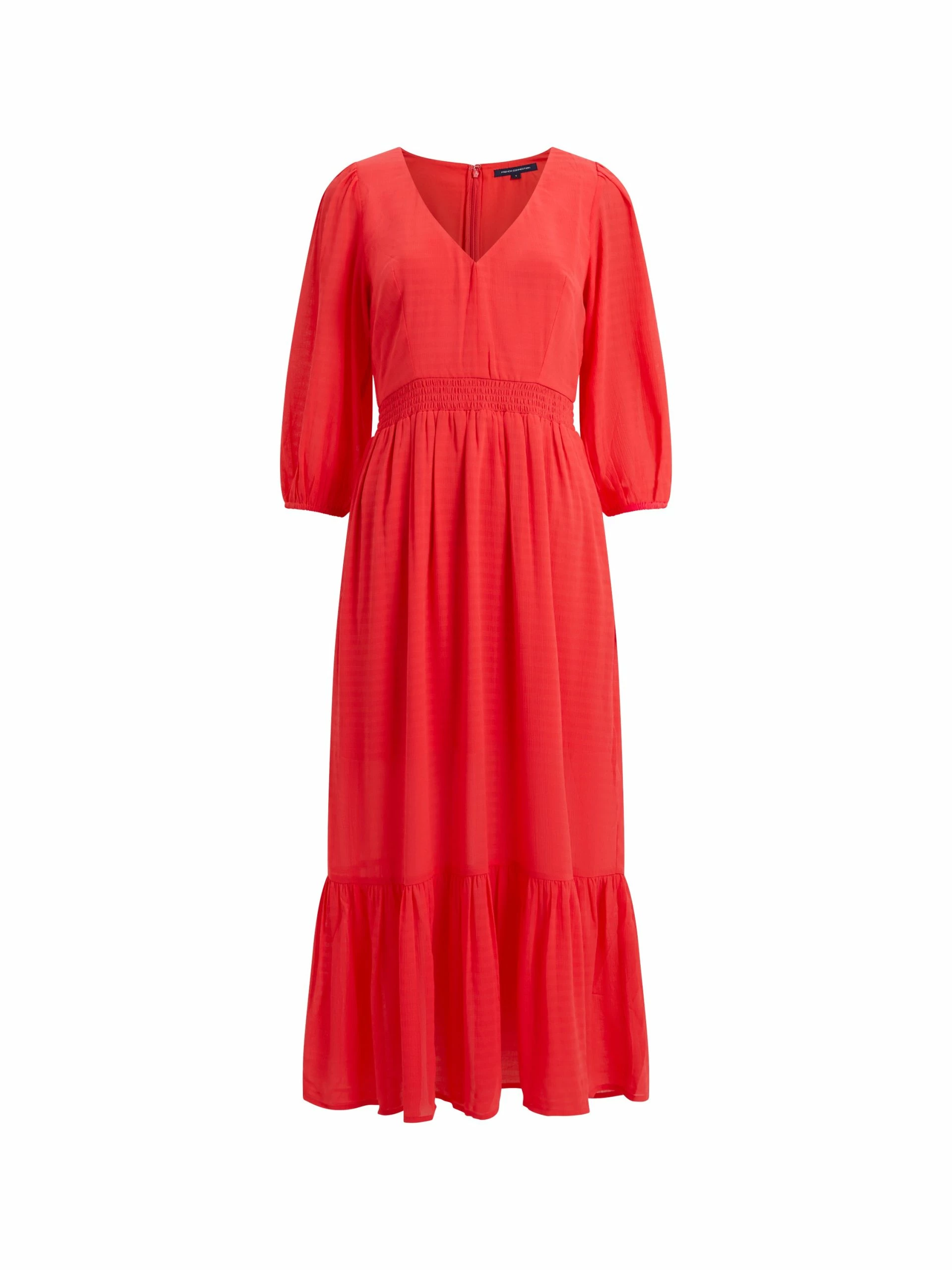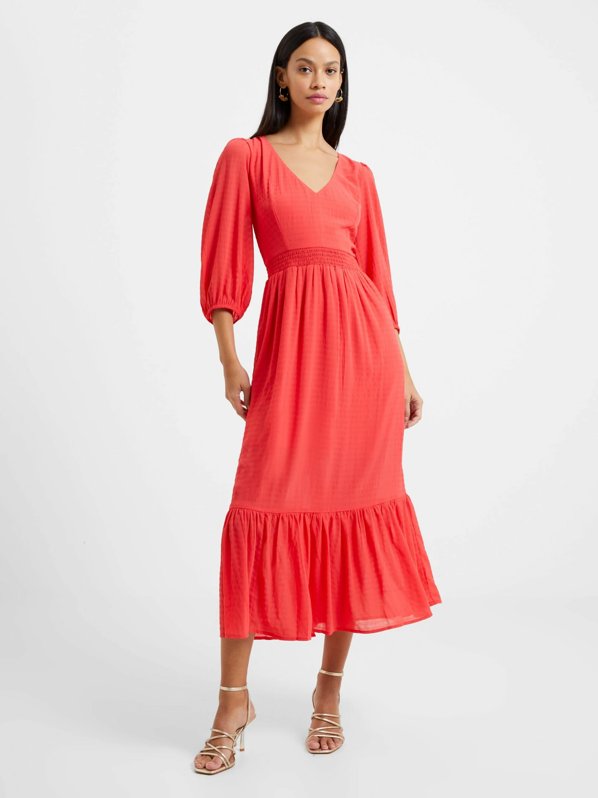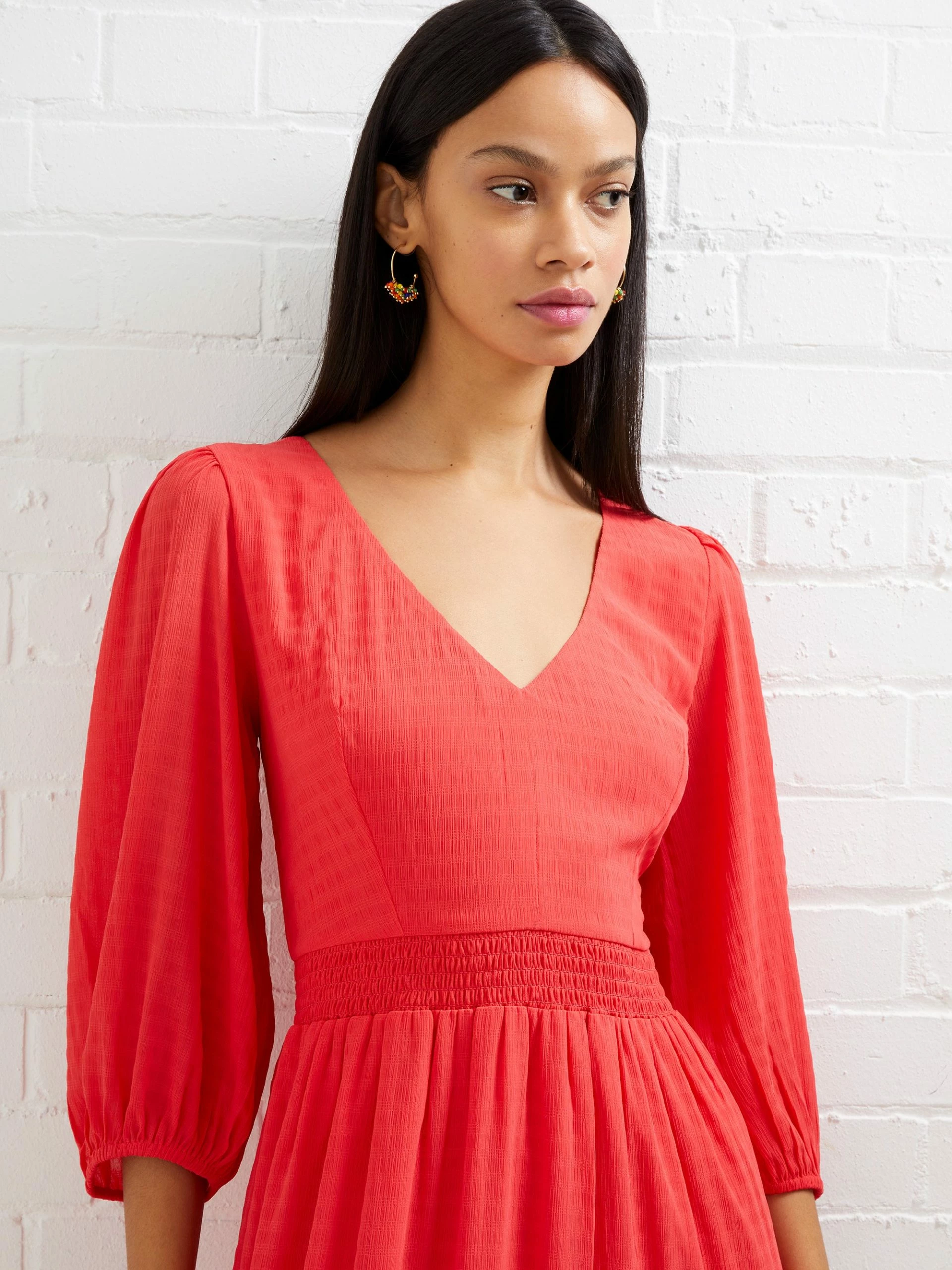 Swing into the new year with our red Cora Tiered Midi Dress. The chic hue is brought to life with a textured finish, bringing sophistication and character to the midi silhouette with voluminous puff 3/4 sleeves and a smocked waist, not forgetting its tiered skirt ideal for stepping into the new season in.