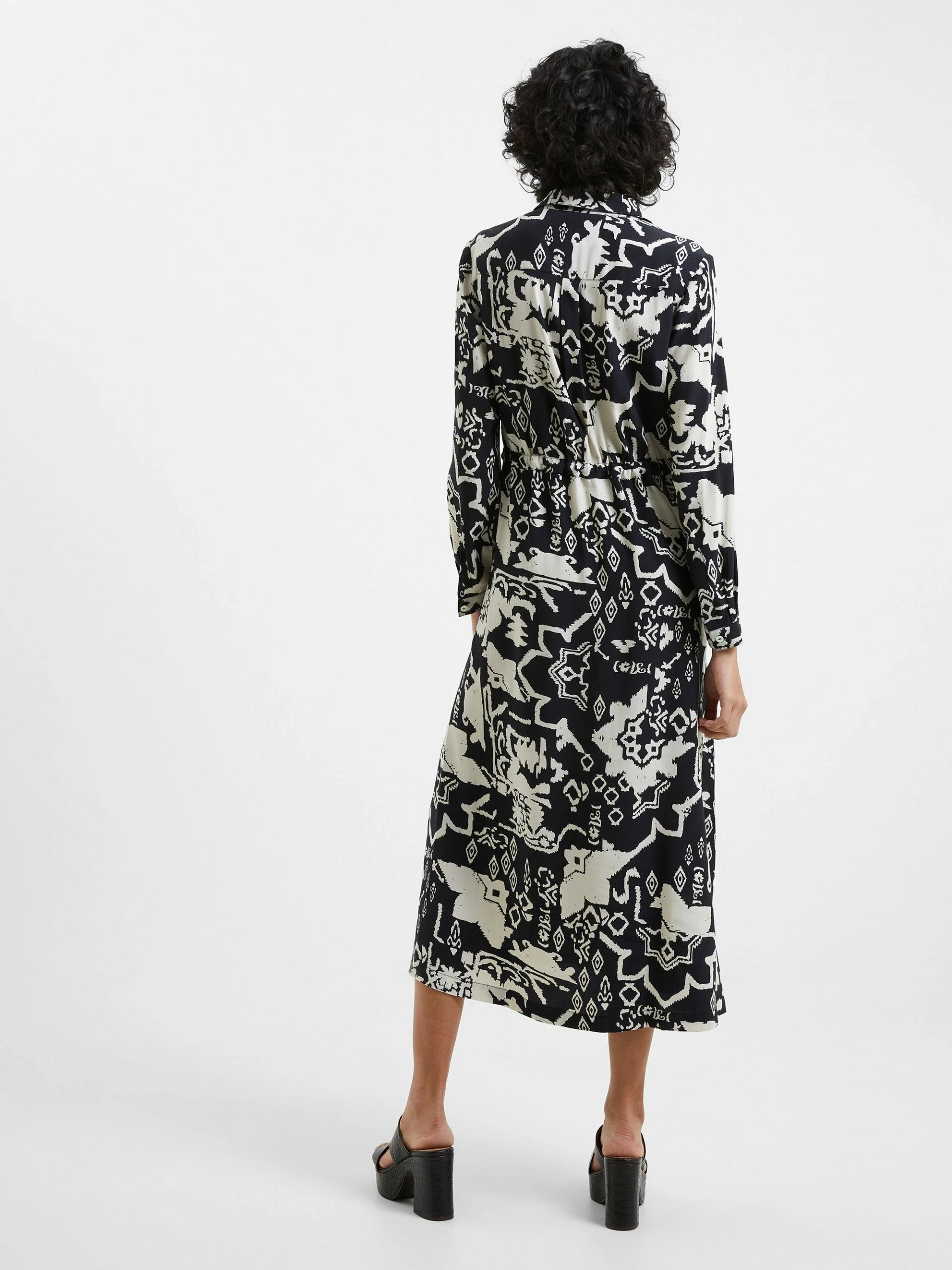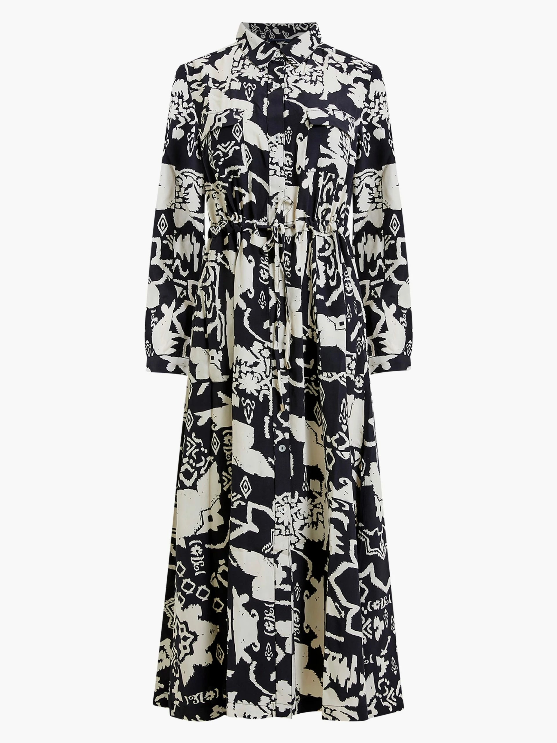 Meet your new monochrome must-have. Our Deon Eco Delphine Drape Shirt Dress is a style to behold, with a revamped shirt dress silhouette featuring a collar, button-through fastening, 2 breast pockets and flirt side split all brought to life in a lively abstract print and pulled together with a self-tie drawstring waist.