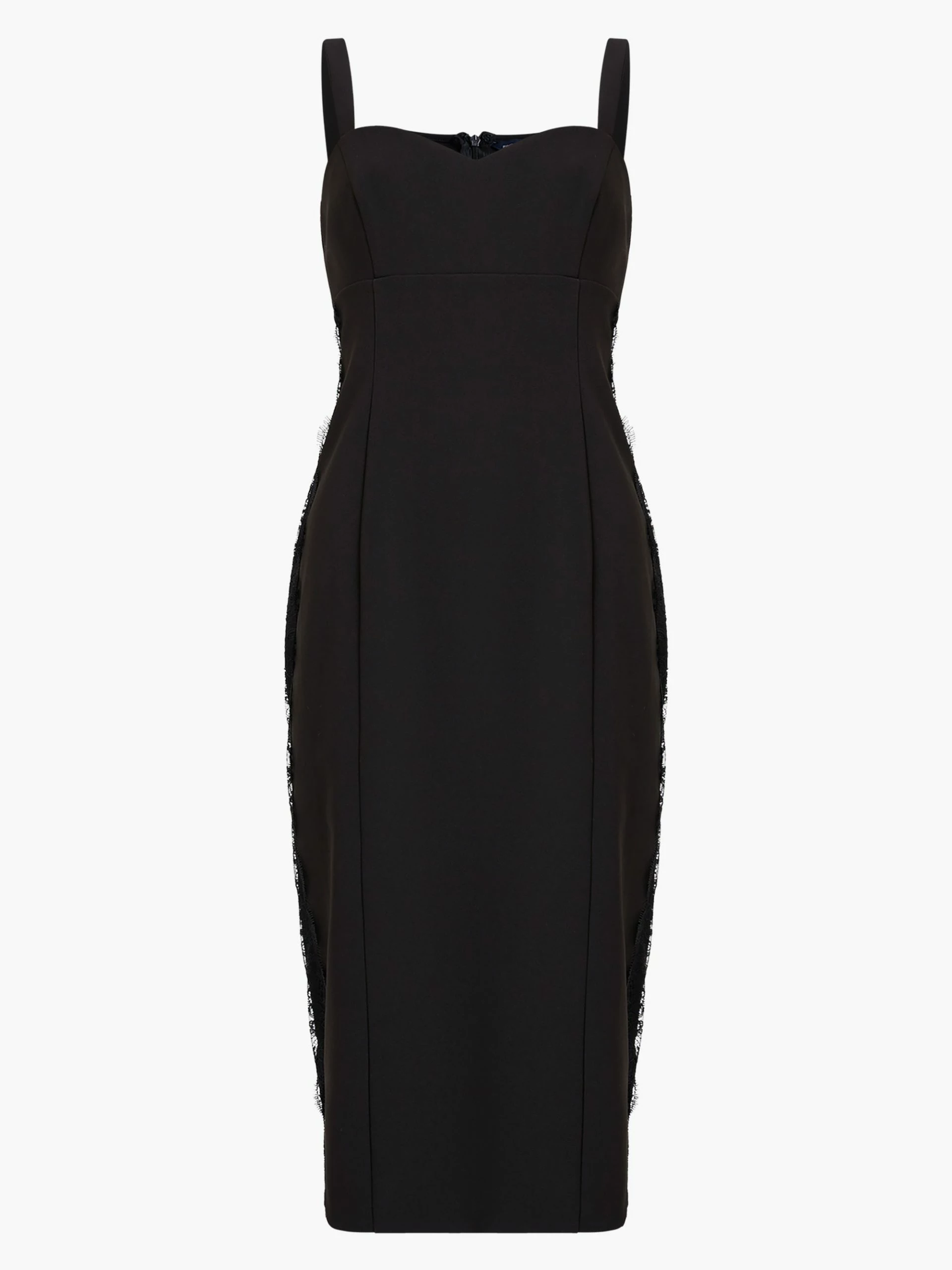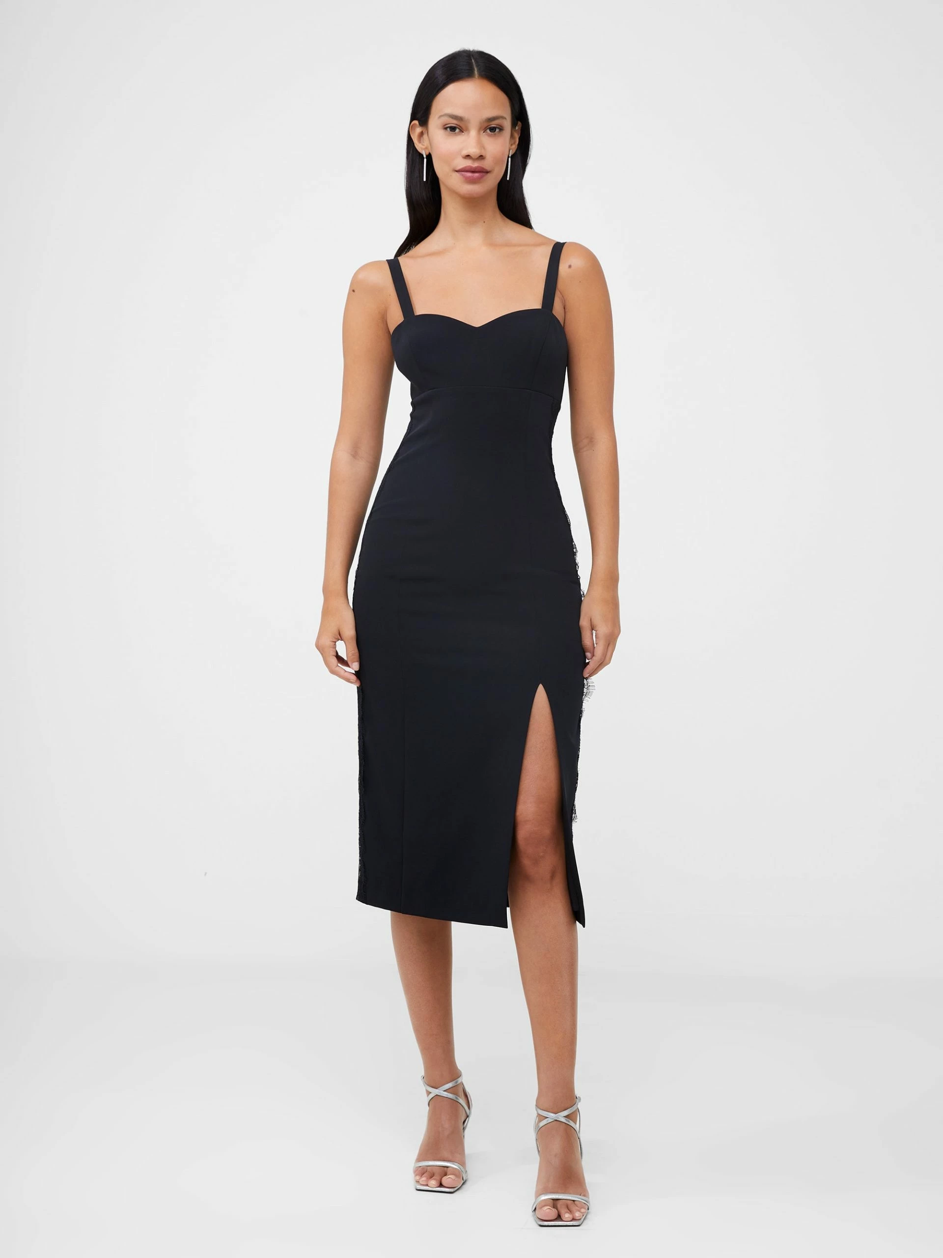 Our Echo Crepe Lace Dress offers a flirty finish to the sweet little black dress. Intricate lace trims add a playful touch to the sides of this style, hosted by adjustable straps and flaunting a smooth silhouette with sweetheart neckline and playful front split.