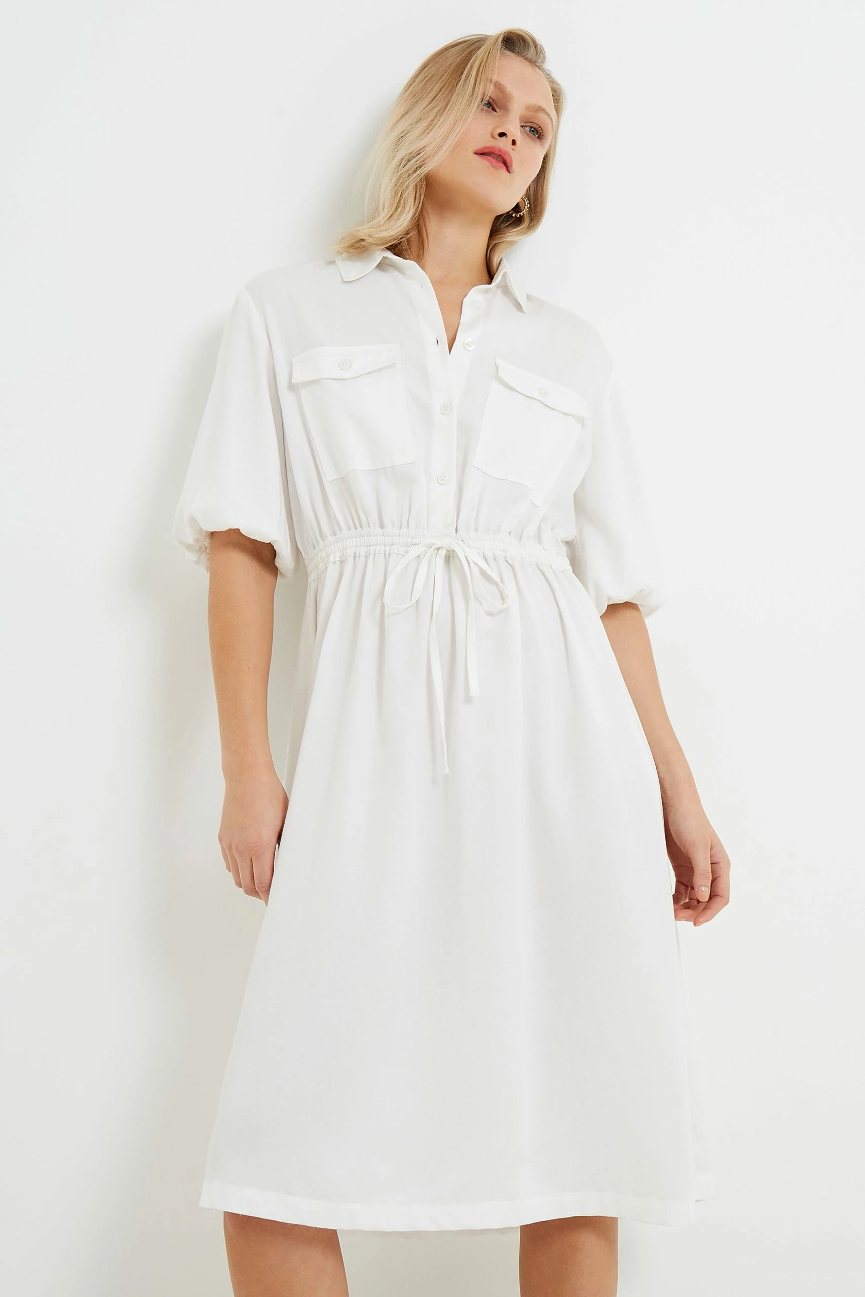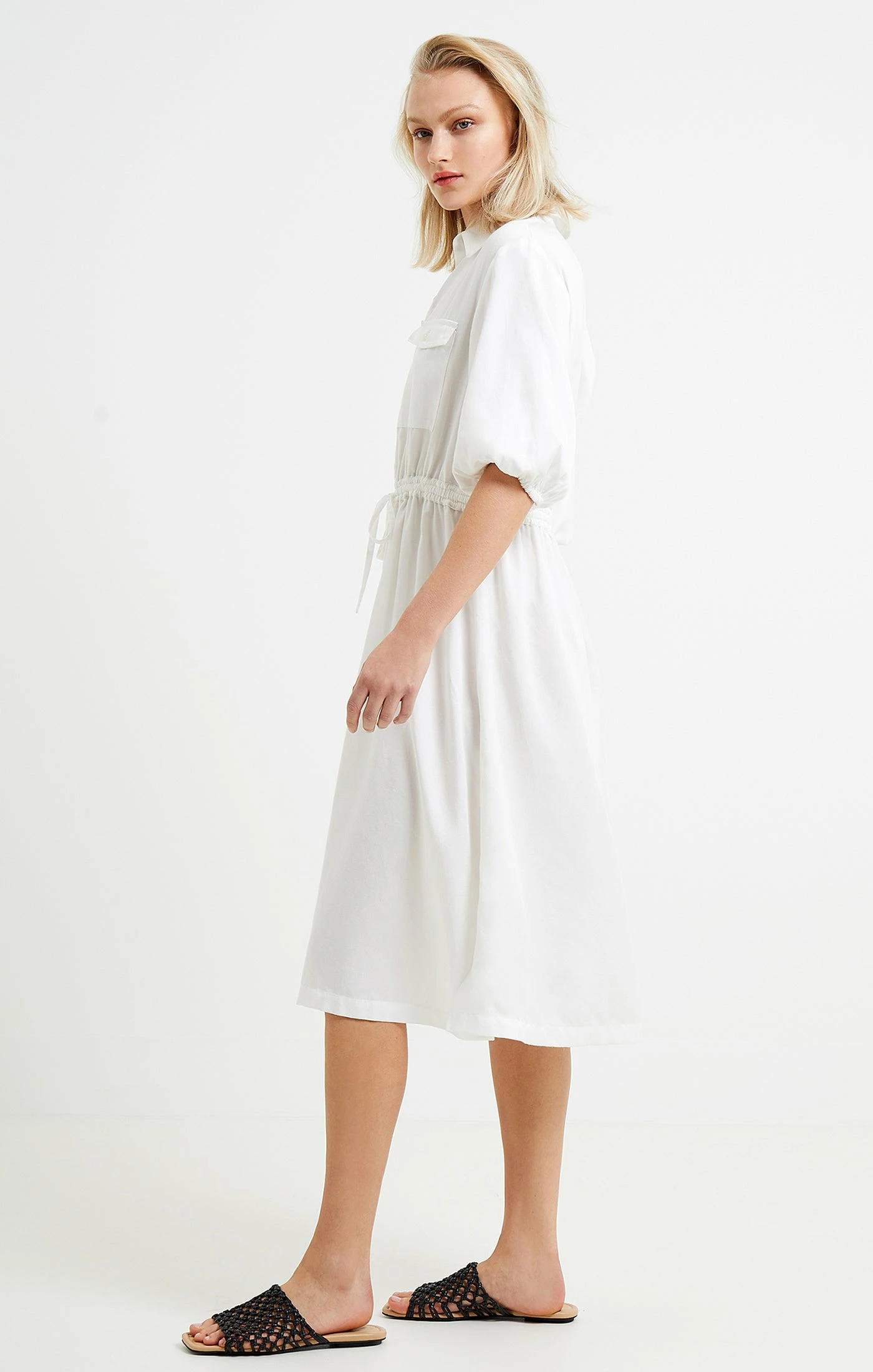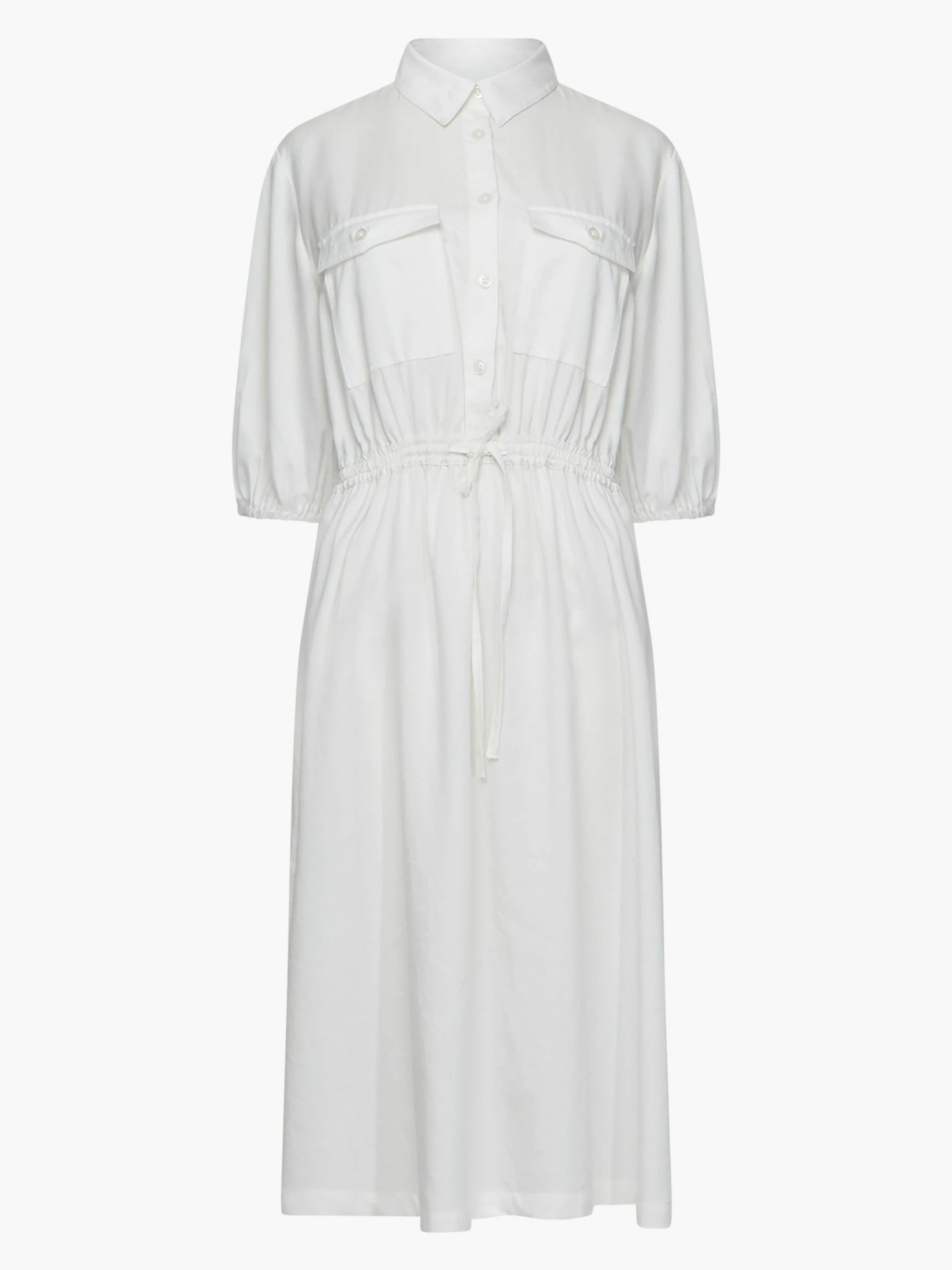 Our Elkie Twill Drawstring Dress is ready for brighter days. From its collar and front contrasting buttons to the mid length sleeves and 4 practical pockets, this dress boasts uplifting utility style to be sought after this season. A drawstring waist makes for a flattering figure and feminine finishing touch with its self-tie bow.