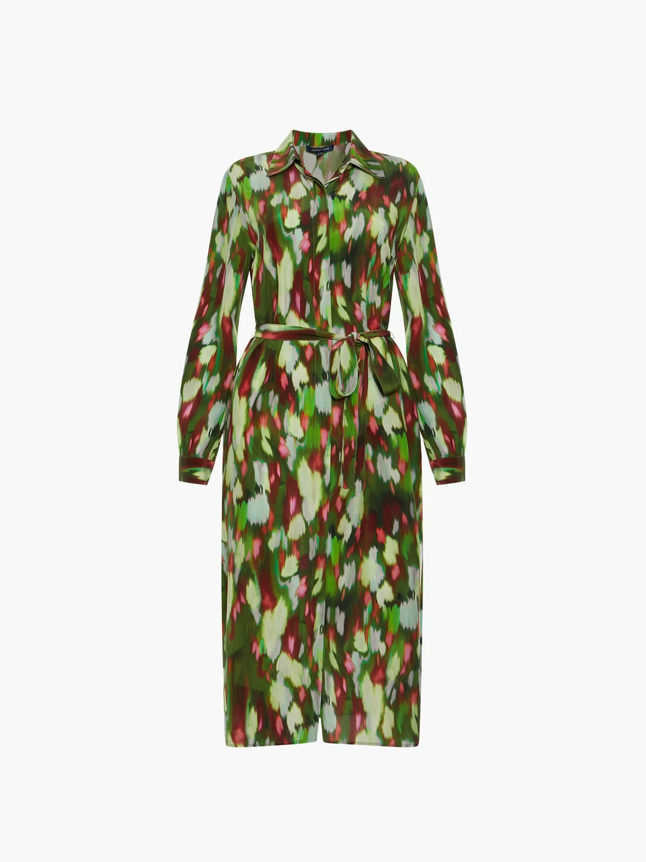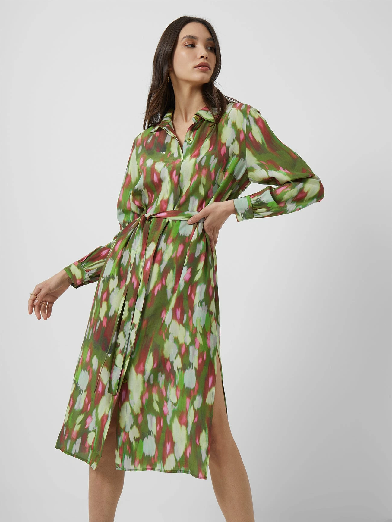 We caught you looking and know you can’t resist a flirt with our Innes Delphine Shirt Dress. The chic shirt dress silhouette with collar and concealed button-down fastening has had a revamp with a captivatingly colourful abstract print, matching self-tie belt and playful side splits, all falling to a flattering midi length.