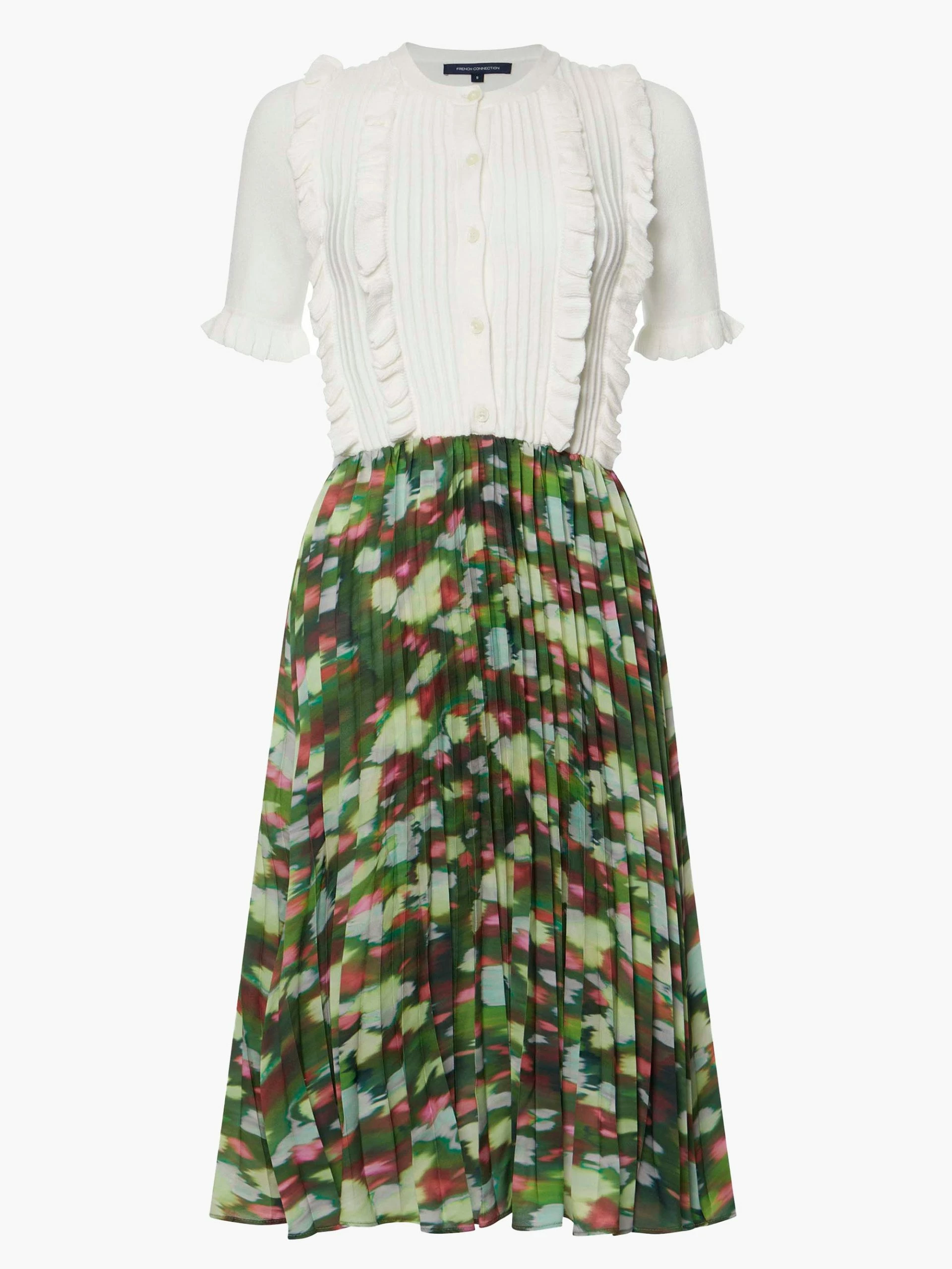 We’re in awe at our all-in-one Lyala Innes Print Pleated Dress. Taking on the appearance of a blouse and skirt, this sweet little number combines a fresh white bodice with romantic ruffle trims, a button-up neckline and pleated detailing with an enchanting watercolour patterned skirt carrying across the pleats with its captivating colours.