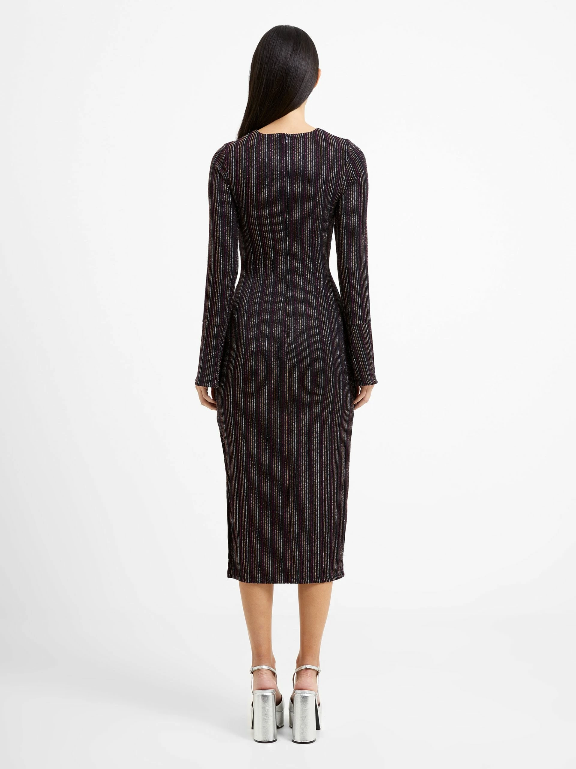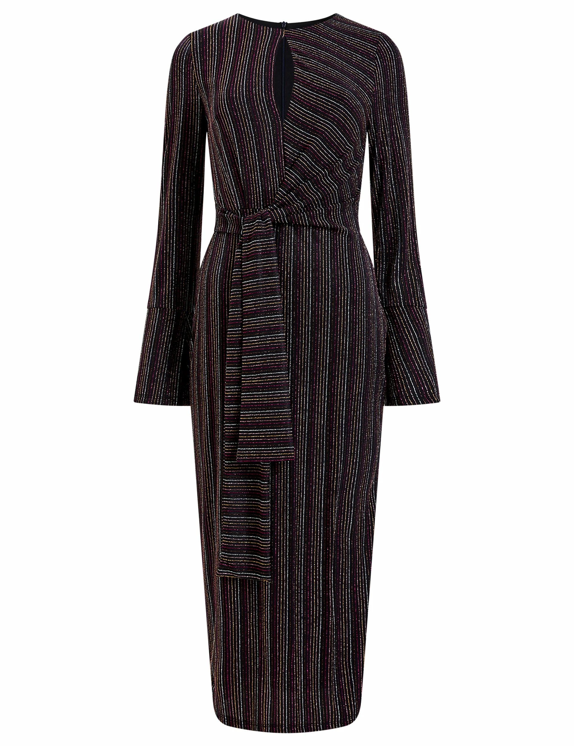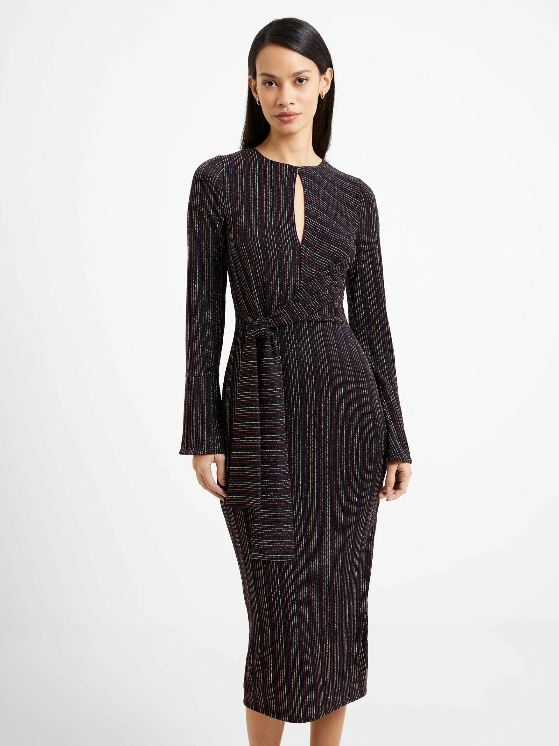 A playful metallic pattern and playful keyhole makes our Paula Keyhole Midi Dress a sought-after style. This midi dress is a party season wonder from its round neckline and flirty side split skirt to its flattering self-tie attached belt and flared sleeves, all graced in glittering lurex stripes.