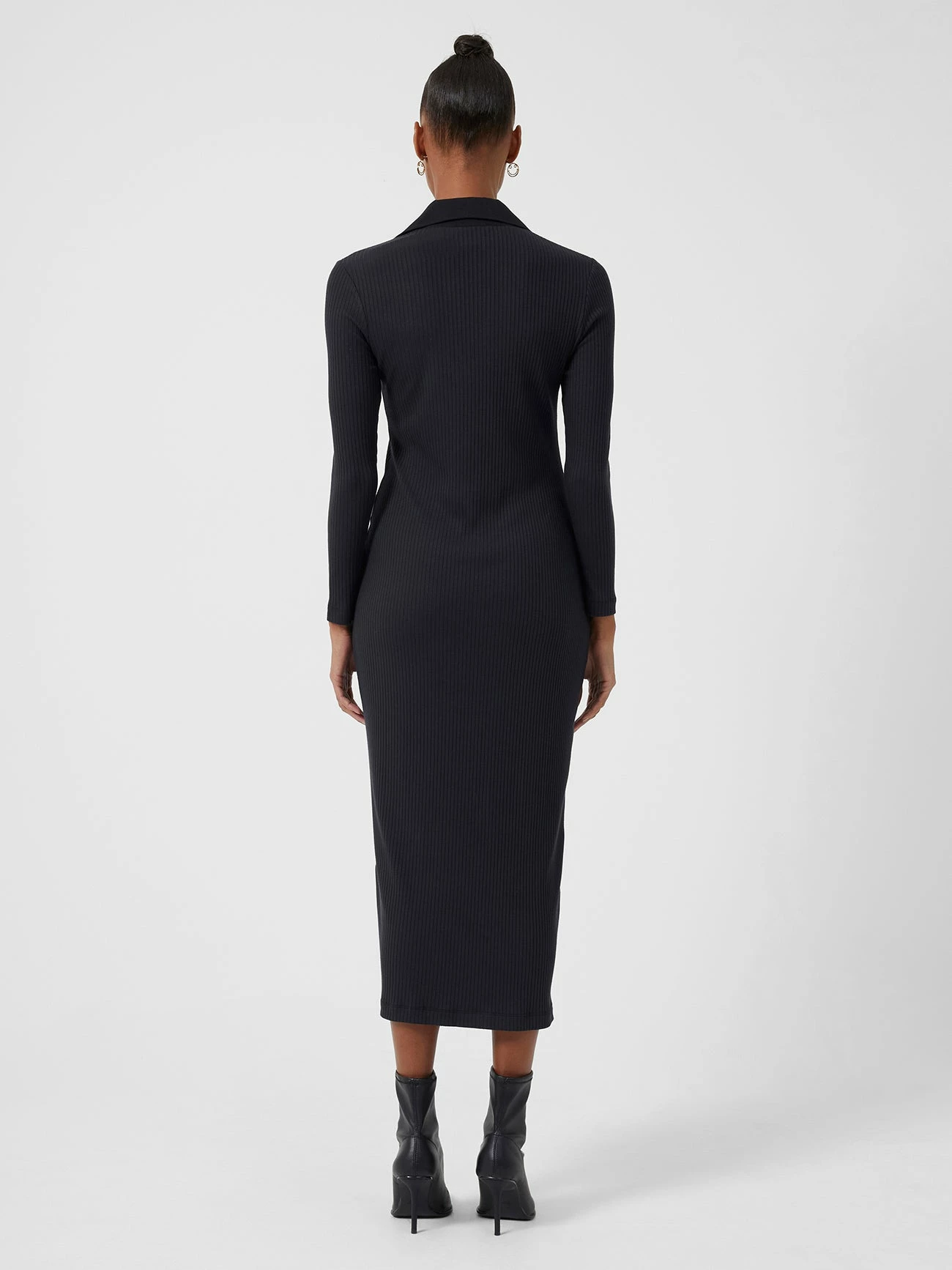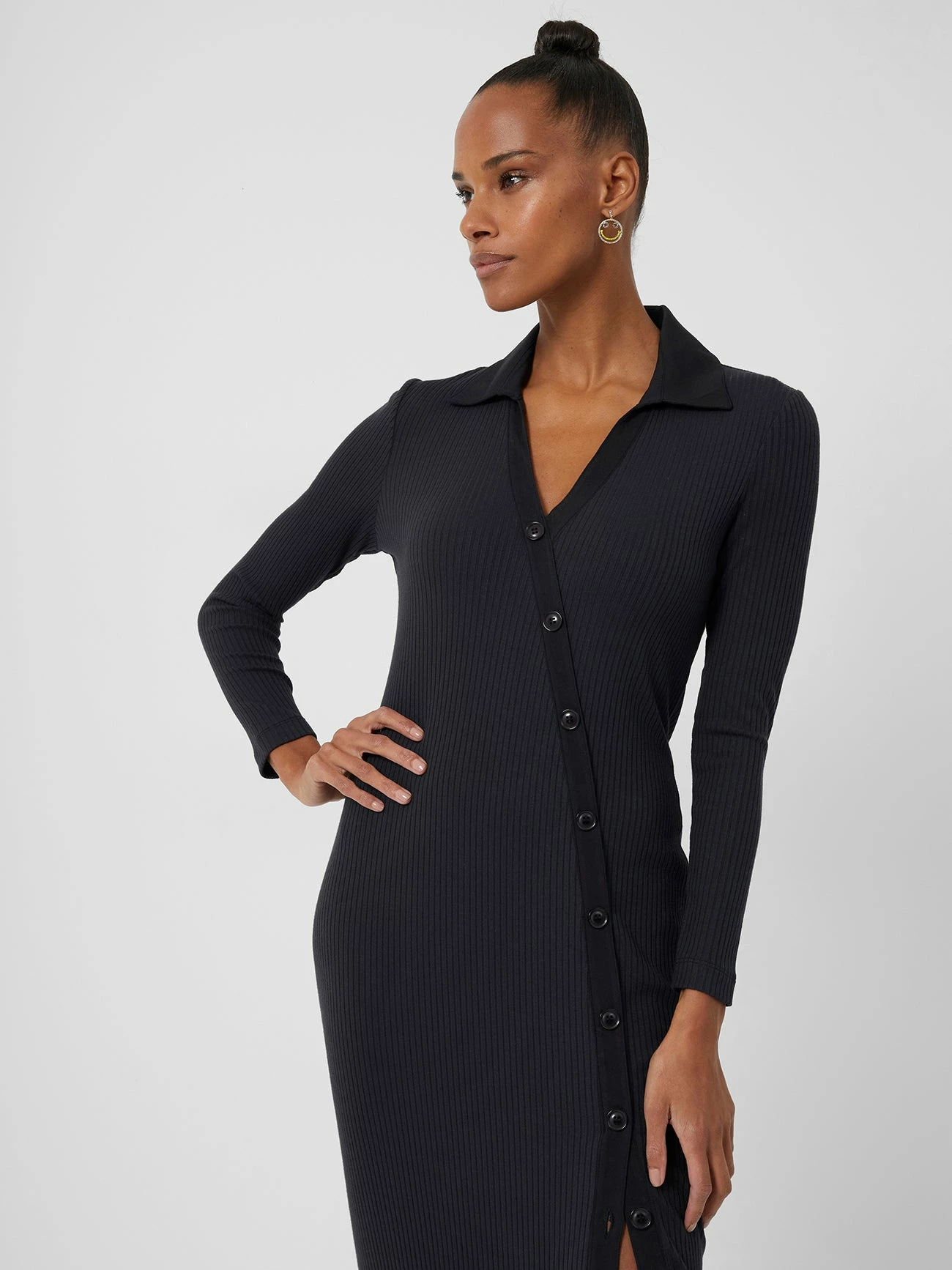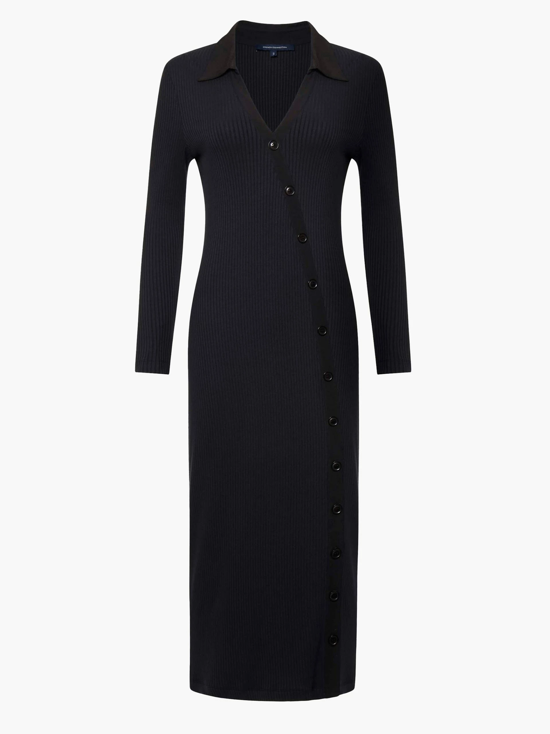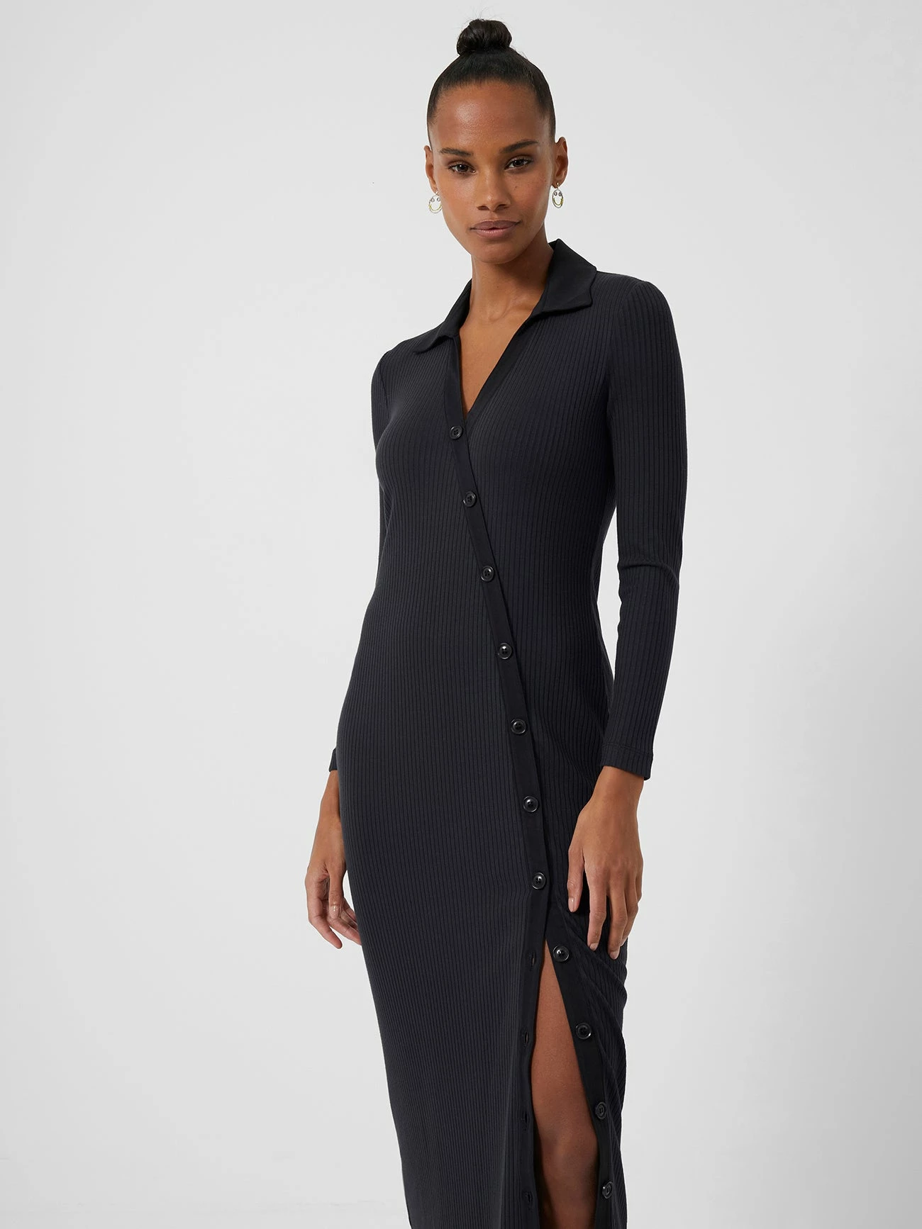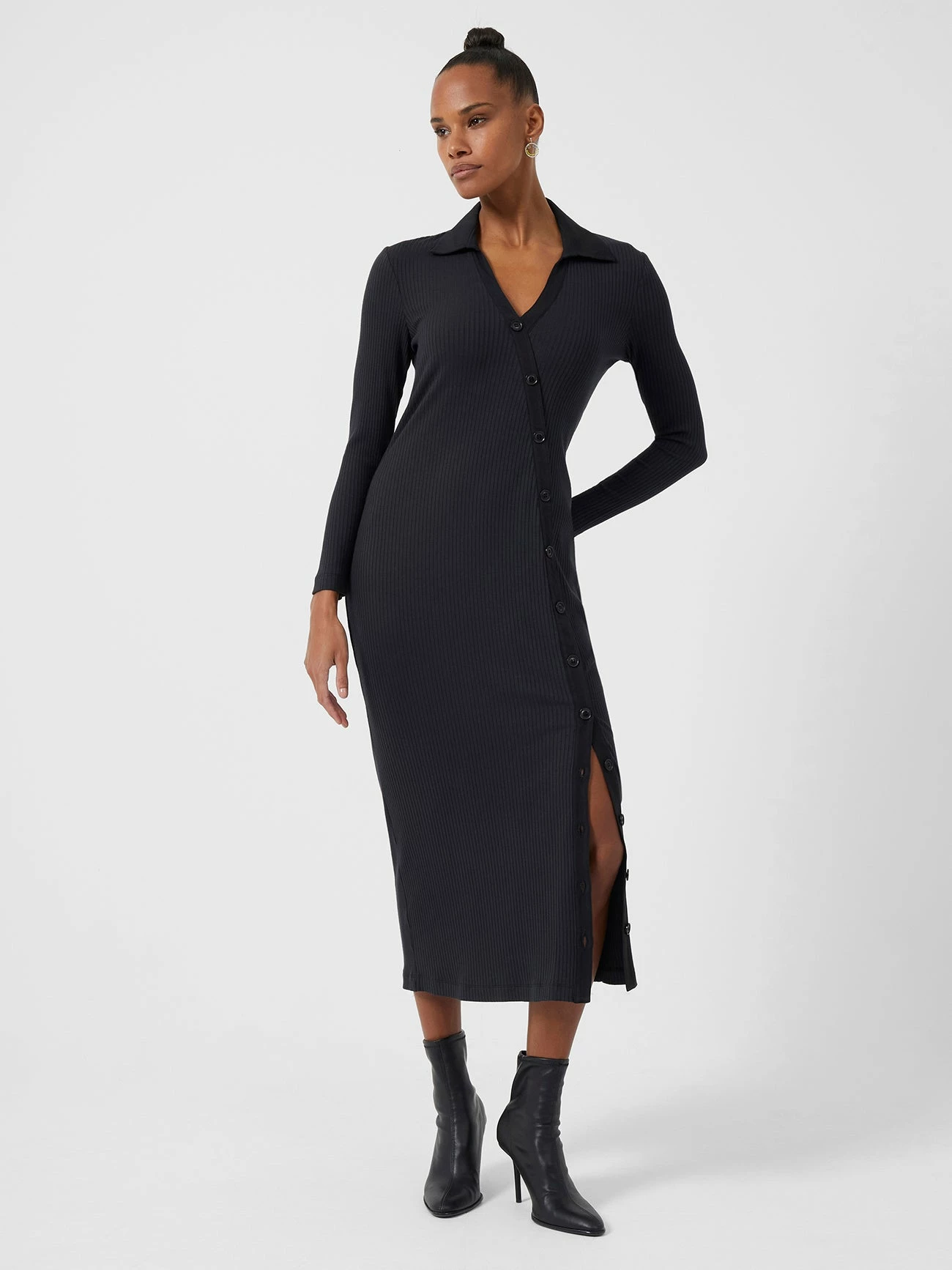 The versatility of the Reina Ribbed Jersey Midi Dress makes it an unstoppable wardrobe staple. The simple black ribbed design is anything but basic, with a v-neck, open collar and long sleeves accompanied by a diagonal formation button-down fastening, allowing you to be as daring as you please in regards to the optional leg split. Enabling an effortless transition from desk to dinner to drinks, Reina is the dress for all occasions.