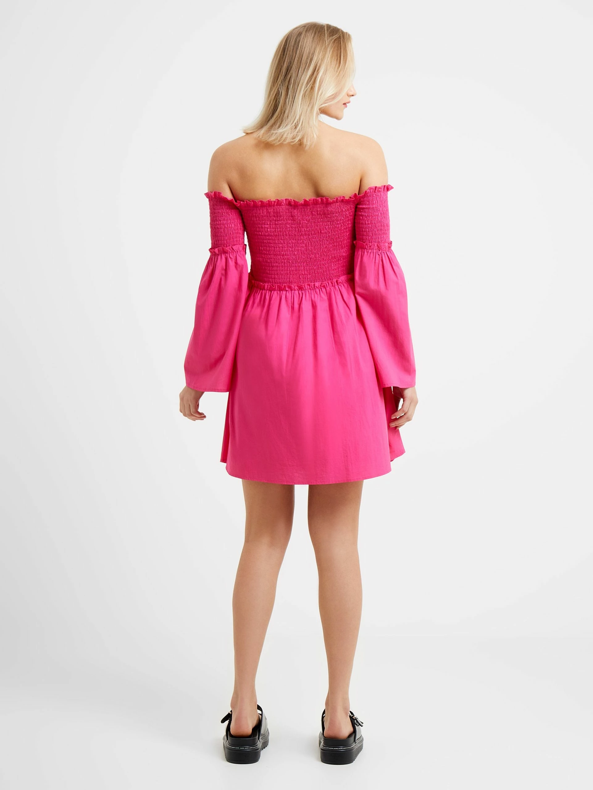 Our Rhodes Poplin Smocked Bardot Mini Dress boasts a fun silhouette destined for summer days. We love a playful off-the-shoulder neckline, and this style compliments it even further with a ruffle trim continued across the sleeves and waistline. Smocking is set to be this season’s big hit, and with this bodice and upper sleeves we can see why, offering a flattering fit offering this silhouette a flare skirt and long fluted sleeves.