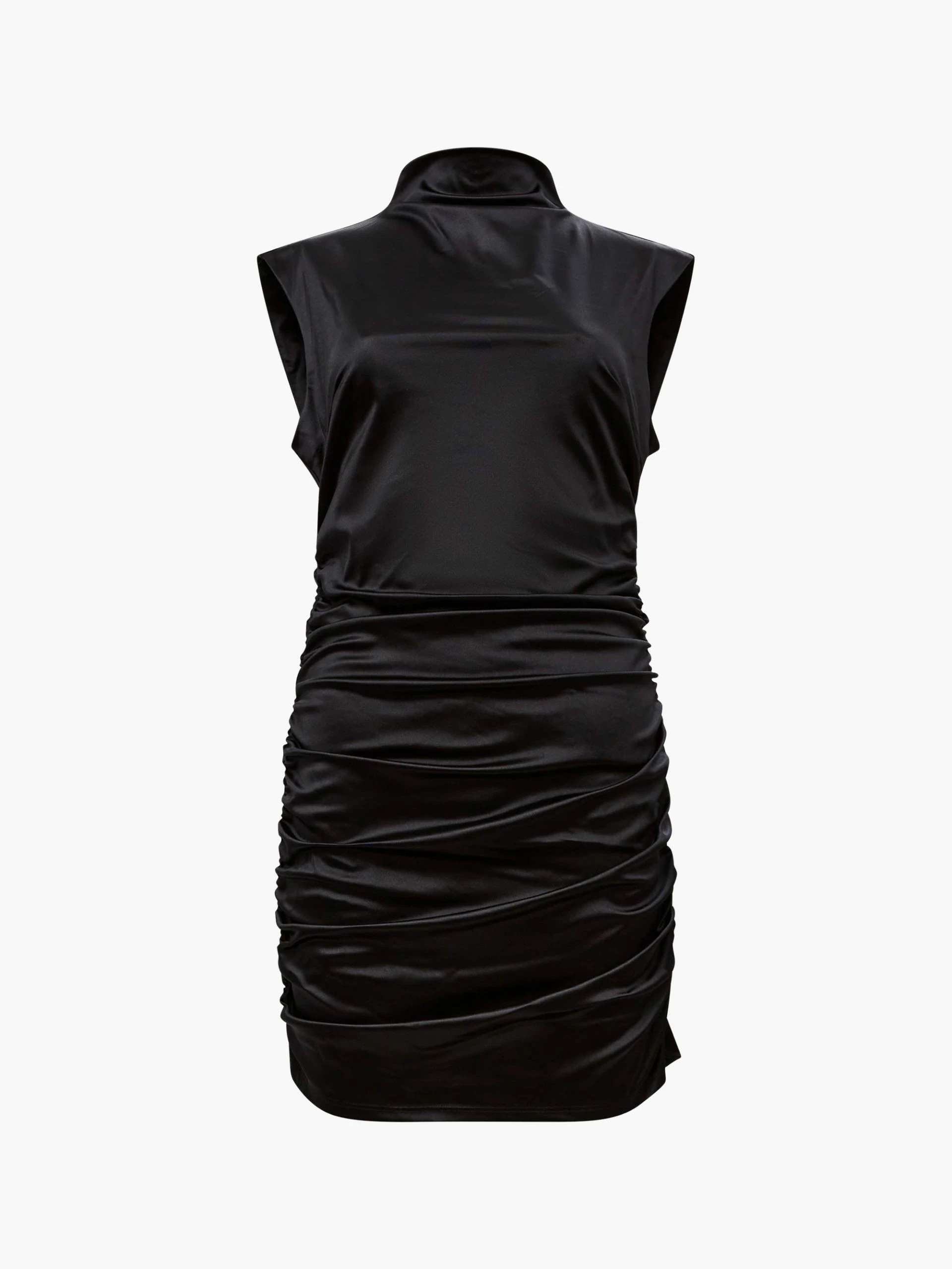 Our Rosita Shine Ruched Mini Dress is a shining example of why every wardrobe needs a Little Black Dress. This sleek mini dress, framed by a high neckline and absence of sleeves, flaunts a flattering ruched figure in a high-shine finish.
