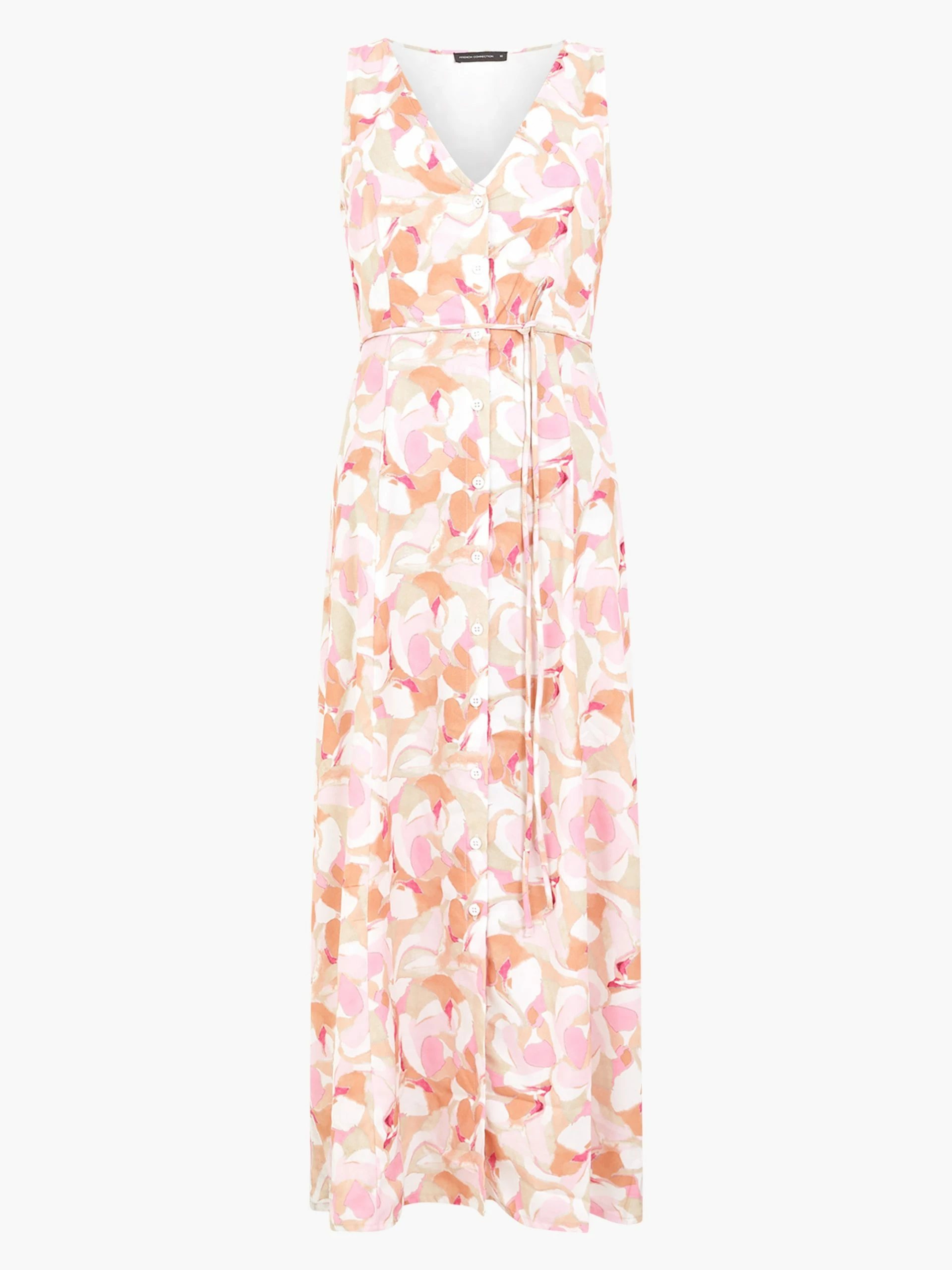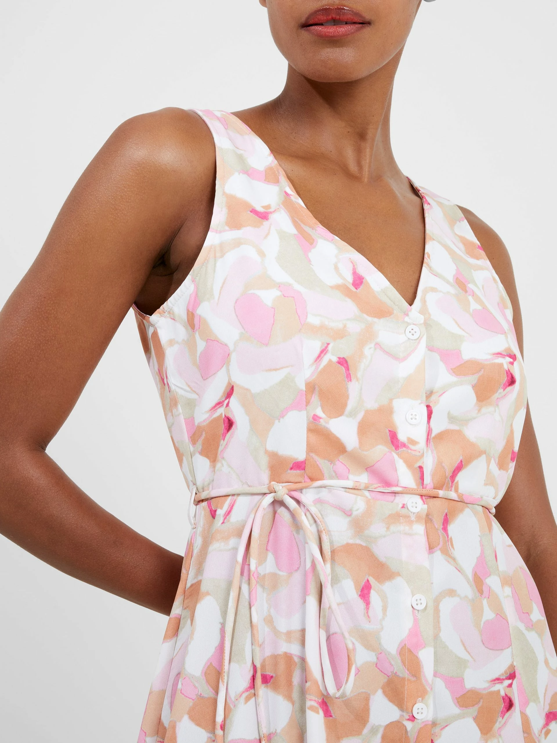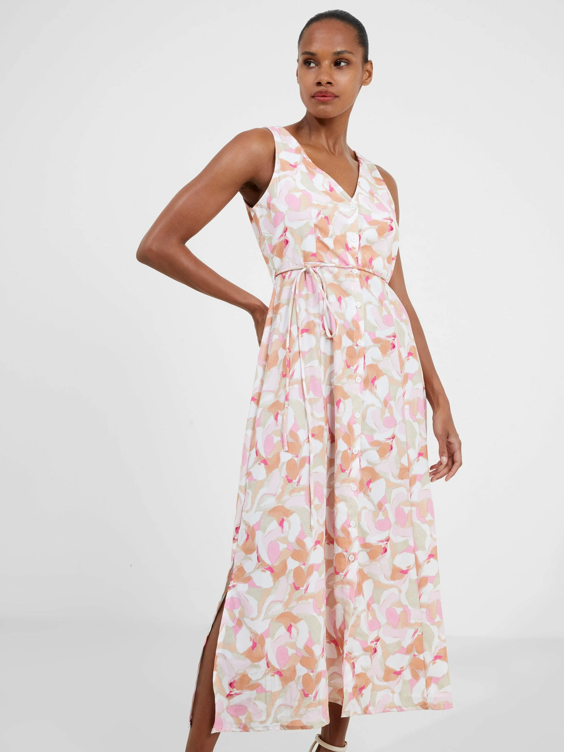 Summer called looking for our Vee Sleeveless Print Dress. This sunshine-ready style boasts a sleeveless silhouette with a sophisticated button-through fastening and flattering self-tie belt, whilst uplifting florals set the scene.