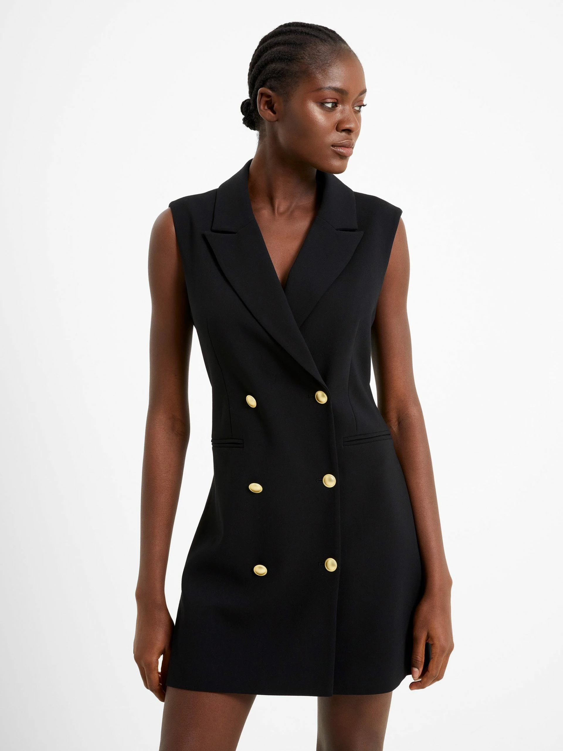 Look chic, look smart with our Whisper Sleeveless Tux Mini Dress. This A-line dress flirts with formal, with a tux-inspired aesthetic flaunting a split lapel collar and v-neckline accompanied by a double breasted fastening. We’re mixing business with pleasure for this piece, and we recommend styling with staple hoop earrings.